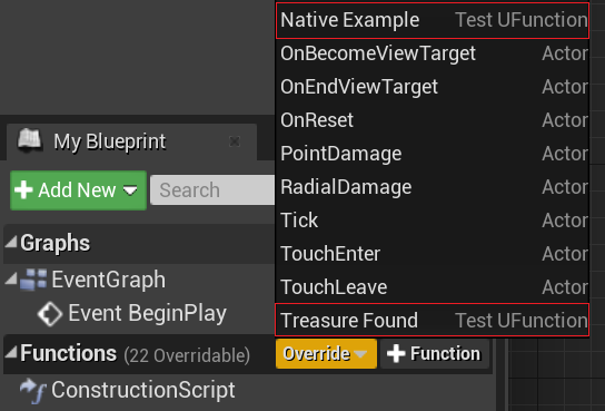 Antes de testarmos, precisamos implementar a função TreasureFound() no Blueprint. Na aba My Blueprint, clique no botão Override que está ao lado de Functions. Veja na listagem que aparecem as funções Treasure Found e Native Example. Clique em Treasure Found.